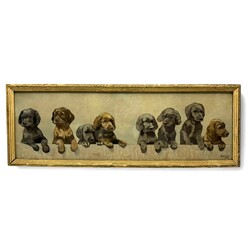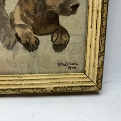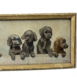 | Omschrijving | Aquarel op papier, voorstelling van acht puppy’s. Rechtsonder gesigneerd Jopie Huisman (Workum 1922 – Groningen 2000), gedateerd 1946. Herkomst: kunst- en antiekveiling Baerveldt IJlst, 20 maart 1991 (als ‘Acht puppy’s, destijds verkocht voor 7.200 gulden. De schilder was destijds aanwezig bij de veiling en hoogst verbaasd over de prijzen van zijn vroege werk: “Ik siet der by en ik tocht: moatst dy idioaten ris sjen”). |