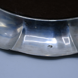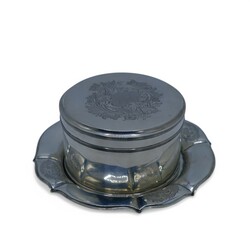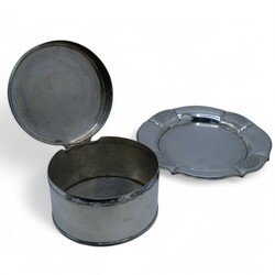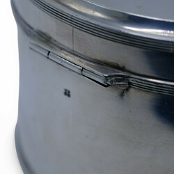 | Omschrijving | Een antieke vroeg 19e eeuwse tweede gehalte (835/1000) zilveren koektrommel, rond model met filetrand, aan de bovenzijde gegraveerd. Mr. Jan Anthonis de Haas sr., werkzaam te Amsterdam van 1812 tot 1835, Jaarletter K (1819). Op laat 19e eeuwse tweede gehalte (835/1000) zilveren onderschotel. |