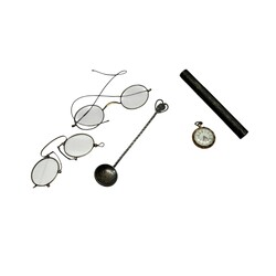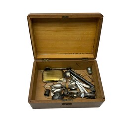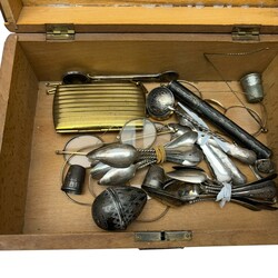 | Omschrijving | Kistje gevuld met diverse items, waaronder een antiek 19e eeuws tweede gehalte (835/1000) zilveren rozenkransdoosje, eivormig, met inscriptie van een kruis en tekst '23 maart 1893', diverse 19e eeuwse tweede gehalte (835/1000) zilveren theelepels, een 14 karaats (585/1000) geelgouden dameshorloge, ca. 1900 en enkele vergulde brilletjes |