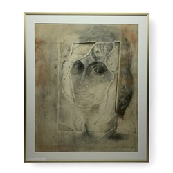 | Omschrijving | Gemengde techniek op papier, portret. Rechtsonder gesigneerd Sjoerd de Vries (Oudehaske 1941 - Leeuwarden 2020), gedateerd 1995. |