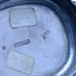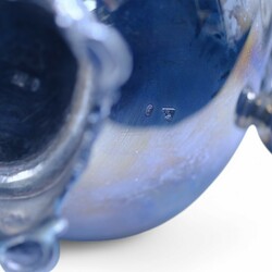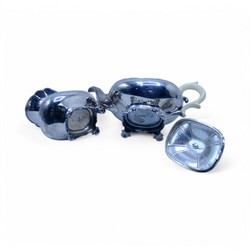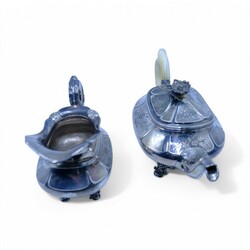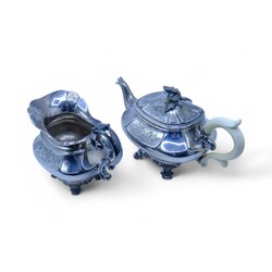 | Omschrijving | Een eerste gehalte (925/1000) Hollands zilveren theepot en melkkan. Achtkantig model, gegraveerd met bloemmotieven en geplaatst op vier pootjes. Voorzien van het meesterteken en winkeliersmerk van Bonebakker & Zoon, het keur van firmant Pieter Pieterse en het essayeursteken van Hendik Willem van Riel, werkzaam te Arnhem/Schoonhoven/Amsterdam tussen 1854 en 1880. Beide objecten tevens gekeurd met jaarletter X (1857). |