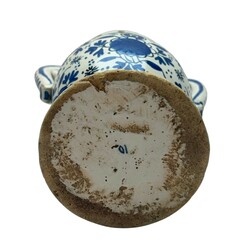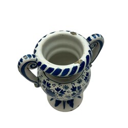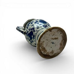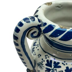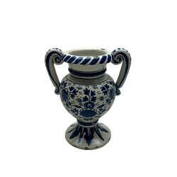 | Omschrijving | Een zeldzaam laat 17e of vroeg 18e eeuwse Delfts aardewerken twee-oren altaarvaas. Blauw/wit en rondom beschilderd met bloemen en peterseliebladeren naar een Chinees voorbeeld. Gemerkt op de ronde voet met een nummer 10 en tussen de bloemen met sterren. Voor de fabriek: "De witte Ster" (1660-1804). Ca 1700. |