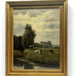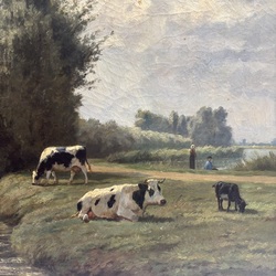 | Omschrijving | Schilderij, olieverf op doek. Hollands landschap met koeien en figuren. Rechtsonder gesigneerd D.P. van Lokhorst (Utrecht 1818 - 1893) Verso oud label met titel ‘Een gezellig plekje’. In vergulde profiellijst. Provenance: veiling AAG, Amsterdam, juni 2008. |