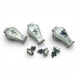 | Omschrijving | Drie 18e eeuwse Delfts aardewerken dekselvazen. Blauw/wit met een decor van een man en vrouw in landschap met rondom relief rococo versieringen. Met originele deksels. Niet gemerkt. Ca 1770. |