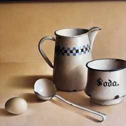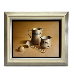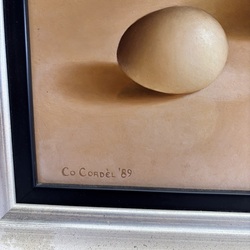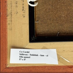 | Omschrijving | Schilderij, olieverf op paneel. Stilleven met emaille kan, sodapotje, lepel en ei. Linksonder gesigneerd Epko Cordel (Bolsward, 1957), gedateerd 1989. |