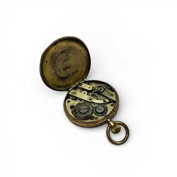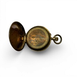 | Omschrijving | Miniatuur gouden zakhorloge met geëmailleerde wijzerplaat en Romeinse cijfers, geplaatst in ronde houder. Met schildpad-achtig etui. 19e/20e eeuw. |