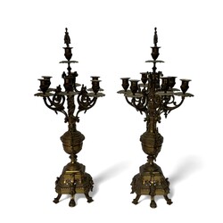 | Omschrijving | Een antieke 19e eeuwse Franse bronzen pendule met twee zevenlichts kandelaars, met bobeches. Wijzerplaat gemerkt ‘D.C. Andriessen Bergen op Zoom’. |