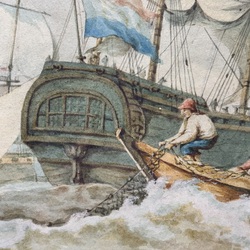 | Omschrijving | Watercolor on paper, depiction of a sailing ship and fishing boat in rough sea. In the distance several ships with Dutch flags. Probably 18th century. |