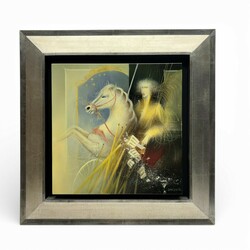 | Omschrijving | Schilderij, olieverf op paneel. Surrealistische compositie met muzikant op paard. Rechtsonder gesigneerd Jean Claude Dresse (Charleroi, 1946). In zilverkleurige baklijst. |