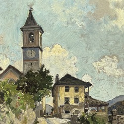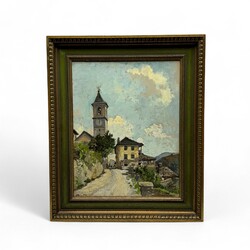 | Omschrijving | Schilderij, olieverf op board. Voorstelling van een dorp in de Alpen met kerktoren, mogelijk omgeving Berzona, Zwitserland. Rechtsonder gesigneerd Johannes Elsinga (Wommels 1893 - Leeuwarden 1969), gedateerd 1951. |