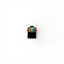 | Omschrijving | 18 karaats roségouden pinkring met cabochongeslepen turquoise, meesterteken 'VA 98' of '86 VA', in doosje |