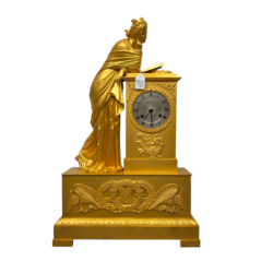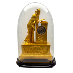 | Omschrijving | Empire vergulde beeldpendule met lezende dame, gedecoreerd met laurierkransen, hoorn des overvloeds en florale motieven. Onder antieke 19e eeuwse klokvormige stolp, met zwarthouten basement. |