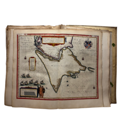 | Omschrijving | 17e eeuws boek, 'Toonneel des Aerdrycx, Oft Nieuwe Atlas, uytghegheven door Wilhelm en Iohan Blaeu', 1642. Tweede deel, eerste en tweede stuk, gebonden in perkamenten band, met in totaal 92 kopergravures, handgekleurde kaarten van Frankrijk, Spanje, Afrika, Azië en de Amerikas: Vrancrijck, Boulogne, Guines, en Oye, Camerijck, Picardien, Vermandois, en Capelle, Het Gouvernement van l’Ile de France, Valois, Beauvoisis, L’Isle de France, Brie, Beausse, Gastinois, en Senonois, Champagne, Rheims, en Rhetelois, Sedan, Raucourt, en Donchery, Lothringen, Metz, Burgundien, Charolois, Genever meer, Bresse, Dombes, Lyonnois, Forez, Beaujolois, en Masconnois, Limoges, en Limoine d’Auvergne, Bourbonnois, Nevers, Berry, Blaisois, en Perche, Touraine, Lodun, en Mirebelais, Anjou, Le Maine, Normandie, Bretaigne, Poictou, Xaintonge, Oleron, en S. Martin, Sarlat, Bordeaux, Bearn, Quercy, Languedoc, Provence, Orange, en Venaissin, Delphine, Savoye, Het rijck van Keiser Karel de Groote voor, Oudt Vrancrijck na de beschrijving van Strabo, en andere oude, Oudt Vrancrijck na de beschrijving van Iul. Caesar, Spaenien, Catalonien, Valentien, Arragon, Navarra, Biscaja, en Guipuscoa, Leon, en Asturius, Gallicia, Portugal, en Algarben, Castilien, en Extremadura, Granaden, en Murcia, Majorca, Minorca, en Yvica, Andalusien, Africa, Fez, en Marocco, Guinea, Abissinen, Neder Aethiopien, en Congo, Asia, Indien, Grooten Mogol, Moluccen, China, en Iapon, Tartariën, Persien, Turckyen, Cyprus, Natolia, Palestina, of ’t Landt van beloffen, America, ofte Nieuwe Wereldt, West-Indie Eylanden, Zuyder Virginia, Florida, Yucatan, Honduras, en Guatemala, Nieuw Nederlandt, en Nieuw Engelandt, Bermudas, Virginia, Florida, Nieuw Spaenjen, en Nieuw Galissien, Terra Firma, Nieuw Granaden, en Popayan, Nieuw Andalusien, en Venezuela, Guajana, ofte de Wilde Kust, Brasil, Rio de la Plata, ofte Paraguay, Tucuman, en S.ta Cruz de la Sierra, Straet Magellanes, Straet le Maire, en Magellanica, Chili, Peru. |