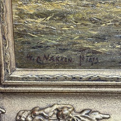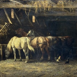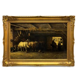 | Omschrijving | Willem Carel Nakken (1835–1926), Stalininterieur met paarden en figuren, olie/doek, ingelijst. |