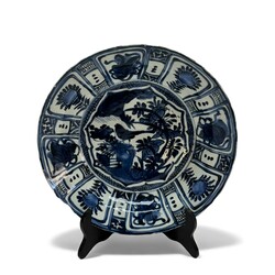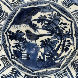 | Omschrijving | Een 17e eeuws porseleinen kraakschotel. Blauw/wit met florale en kostbaarheden decors en op het plat een landschap met vogel (kraai). Wanli ca 1600. |