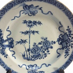 | Omschrijving | Lot divers: een antieke 18e eeuwse Chinees porseleinen schotel, Qianlong periode (1735-1796), met blauw-wit decor van bloemen en kostbaarheden. Met daarbij een 17e eeuwse schepentegel, volgens achterzijde uit ‘de Ossekop’, Leeuwarden. |