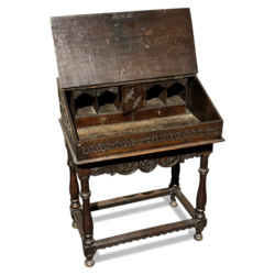 | Omschrijving | Een antieke 18e eeuwse eikenhouten gestoken Engelse secretaire, vierpoots, met aan de binnenzijde met twee laadjes en deurtje. |