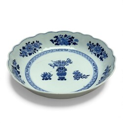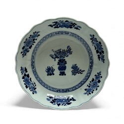 | Omschrijving | Een antieke 18e eeuwse Chinees porseleinen schotel met hoge rand, Qianlong periode (1735-1796). Met onderglazuur blauw floraal decor op de rand en centraal met kostbaarheden. |