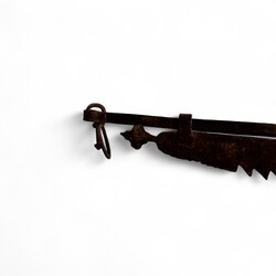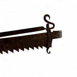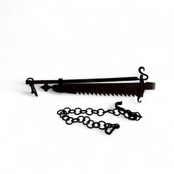 | Omschrijving | Een antieke ijzeren vuurzaag of haal aan een handgesmede ijzeren ketting. 18e eeuws of ouder. |