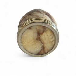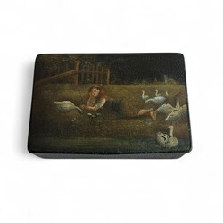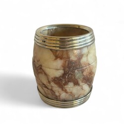 | Omschrijving | Lotje: een antiek19e eeuws Frans lakwerken dekseldoosje, met aan de bovenzijde voorstelling van een meisje tussen ganzen. Met daarbij een 19e eeuwse albasten sigarenbeker met tweede gehalte (835/1000) Nederlands zilveren rand |
