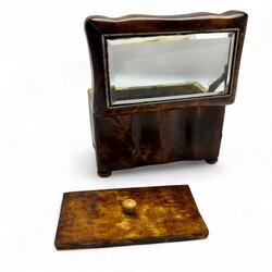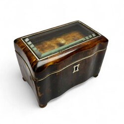 | Omschrijving | Een antiek 19e eeuws schildpad theekistje, ca. 1870, met gebogen zijkanten, geplaatst op vier bolpootjes. Met gefacetteerd glas in de deksel en met binnendeksel. |