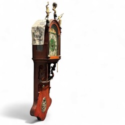 | Omschrijving | Antieke Friese staartklok, wijzerplaat met afbeelding van dorpsgezicht en versierd met vier jaargetijden. Kap getooid met drie antieke houden beelden. |