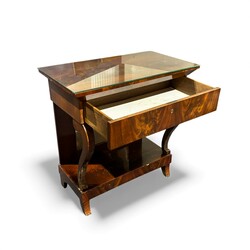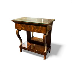 | Omschrijving | Een antieke 19e eeuwse trumeau. Mahoniehouten gefineerd, met gebogen poten, één lade met sleutel. Met glazen blad. |