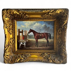 | Omschrijving | Schilderij, olieverf op paneel. Voorstelling van een paard en hond, met ruiter op de achtergrond. Ongesigneerd, 20e eeuws. |