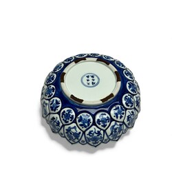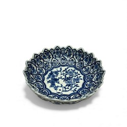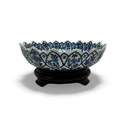 | Omschrijving | Een 20e eeuwse Chinees porseleinen schaal, lotusvormig, met decor van bloemen, in Kangxi stijl. Aan de onderzijde gemerkt met zeskaraktermerk, met houten sokkel. |
