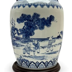 | Omschrijving | Een grote 20e eeuwse Chinees porseleinen balustervormige vaas. Blauw-wit, met voorstelling van spelende kinderen in een tuin. O.a. twee kinderen met een tol, één die een libelle achtervolgt en één geblinddoekt. Aan de onderzijde met apocrief Kangxi merk in dubbele ring. Op houten sokkel. |