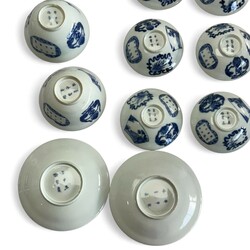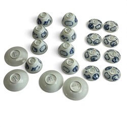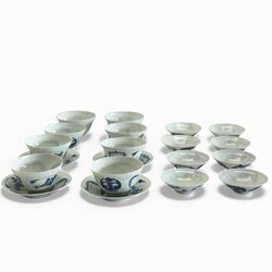 | Omschrijving | Lot met acht laat 19e eeuwse Japanse eierschaal porseleinen kopjes, met acht deksels en vier schotels, Meiji periode. Onderglazuur blauw decor, met o.a. landschappen en karaktertekens in medaillons. Alle objecten gemerkt met zeskaraktermerk, vermoedelijk Hirado. |