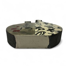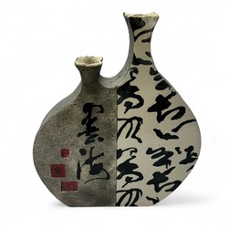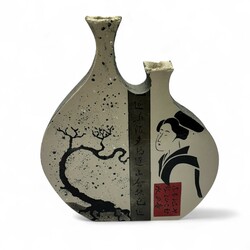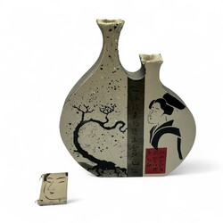 | Omschrijving | Een 20e eeuwse steengoed vaas, aan de voorzijde beschilderd met een geisha, boom en Japanse karaktertekens voor ‘Een zee van inkt’, ‘perfect’, ‘heuvel houden herfstkleuren vast, zwanen vliegen langzaam’ & ‘een oude, een kikker springt erin, geluid van water’. Door Anneke Harting (1948), met certificaat (met steengoed omslag). |