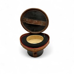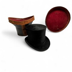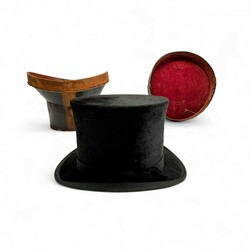 | Omschrijving | Een antieke zwarte hoed, gemerkt ‘Cathbertson London’. In lederen doos |