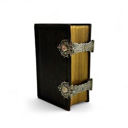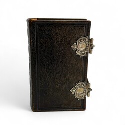| Omschrijving | Een antieke Bijbel met goud-op-snee en in lederen kaft, 'Het Nieuwe Testament of Alle Boeken des Nieuwen Verbonds Onzes Heeren Jezus Christus', Joh. Enschede & Zonen, 1909. Met twee 18e eeuwse zilveren sloten, gegraveerd met stippelgravure 'J.H. 1776' en meesterteken 'B.D' . |