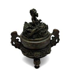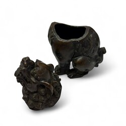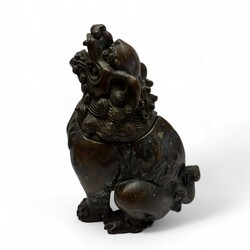| Omschrijving | Bronzen Chinese tempelleeuw, fijn gegoten, 19e/20e eeuw, samen met klein bronzen dekselpotje. |