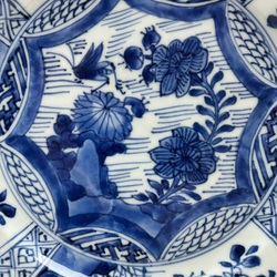 | Omschrijving | Een antieke 18e eeuwse Chinees porseleinen bord, Kangxi periode (1664-1722), met onderglazuur blauw-wit beschildering, vlakverdeling met geometrische motieven en bloemen. Aan de onderzijde gemerkt met bloem in dubbele ring.. |