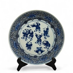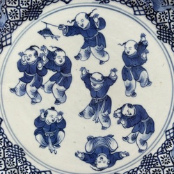 | Omschrijving | Een 18e eeuws Chinees porseleinen schotel. Blauw/wit met florale rand met vleermuizen. Met een decor van acht spelende zotjes op het plat. |