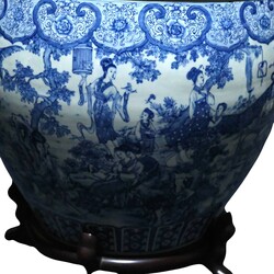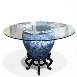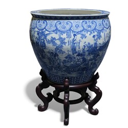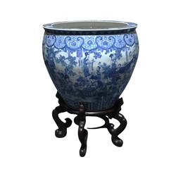 | Omschrijving | Een 20e eeuwse Chinees porseleinen vissenkom, rondom gedecoreerde met onder andere musicerende figuren, geplaatst op houten sokkel. Met groot rond glazen blad. |