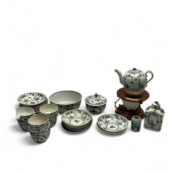 | Omschrijving | Een lot bestaande uit diverse delen van een Duits theeservies met een blauw/wit Saksisch decor. Bestaand uit een theeketel, theebus, suikerpot en diverse kop en schotels. gemerkt met de gekruisde zwaarden, naar Meissen. 19e eeuws of vroeger |