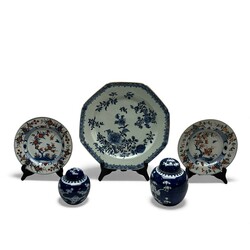 | Omschrijving | Lot Chinees porselein, waaronder een grote zeskantige schotel, blauw-wit, en twee imari borden, allen Qianlong periode (1735-1796) . Met daarbij twee 20e eeuwse powderblue gemberpotten |