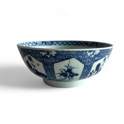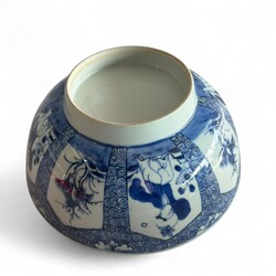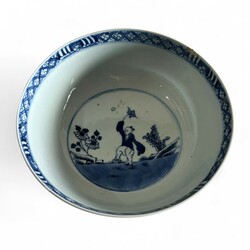 | Omschrijving | Lot van drie antieke 18e eeuwse Chinees porseleinen kommen, Qianlong periode (1735-1796), met onderglazuur blauw-wit decor van zotjes. |