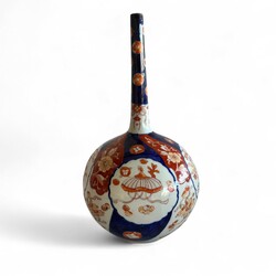 | Omschrijving | Lot van drie antieke 19e eeuwse Japans imari vazen, één pijpvaas en twee knobbelvazen. |