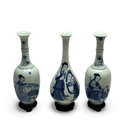 | Omschrijving | Lot van drie 20e eeuwse Chinees porseleinen vaasjes, twee met voorstelling van moeder met twee kinderen en één met voorstelling van moeder en dochter. Alle drie gemerkt met zeskaraktermerk en op houten sokkels. |