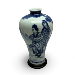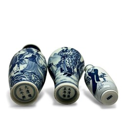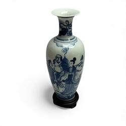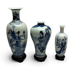 | Omschrijving | Lot van drie 20e eeuwse Chinees porseleinen vaasjes, één met voorstelling van Chinese vrouw in mantel (winterkoningin?), de andere twee met mythologische voorstellingen en diverse figuren. Allen gemerkt aan de onderzijde en op houten sokkels. |