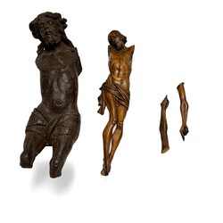 | Omschrijving | Drie antieke Christus beelden. Een bronzen Curpus Christie en twee losse Christus figuren, 1 van palmhout met losse armen en een eikenhout niet compleet exemplaar, mogelijk Spaans 17e eeuws. |