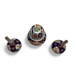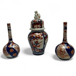 | Omschrijving | Drie Japans Imari vaasjes, bestaande uit een dekselvaasje en twee pijpvaasjes. Hierbij een cloisonée op koper bekervaas met florale decors op houten sokkel. |