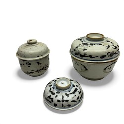 | Omschrijving | Drie stuks Chinees scheepswrak porselein. Bestaande uit twee dekselpotten en een losse deksel. Blauw/wit met resten van beschilderingen. 18e eeuws |