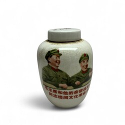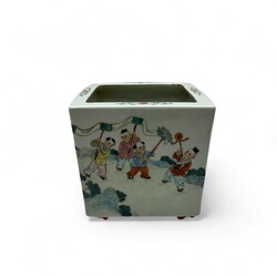 | Omschrijving | Een lot Chinees porselein, bestaande uit een vierkante bloembak op niet bijpassende ronde onderschotel, ploychroom beschilderd met spelende zotjes. Hierbij een gemberpot met deksel met communistische soldaten en teksten. 20e eeuws. |