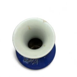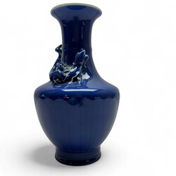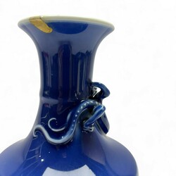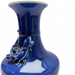 | Omschrijving | Een antiek Chinees porselein vaas met draak en trompetvormige hals in een blauw monochroom glazuur. Met rondom lotusbladeren decors. Niet gemerkt. 20e eeuws of eerder. |