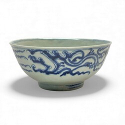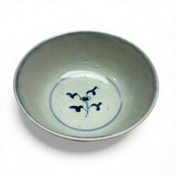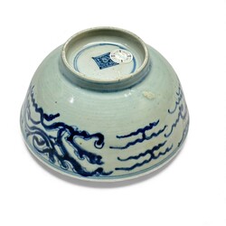| Omschrijving | Een vroeg 19e eeuws Chinees porseleinen kom. Blauw/wit met twee gestilleerde draken rondom en een floraal decor op het plat. Afkomstig uit de Diana Cargo, gezonken in 1817. Met Chistie's sticker aan onderzijde. |